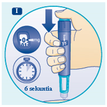 I Työnnä neula ihon alle siten, kuin lääkäri tai sairaanhoitaja on neuvonut. Pistä annos painamalla annospainiketta kunnes numero 0 on näytössä osoittimen kohdalla. Samalla kun teet näin, saatat kuulla tai tuntea naksahduksen. Anna neulan olla ihon alla vähintään 6 sekuntia varmistaaksesi, että saat koko annoksen. Sinun ei tarvitse painaa annospainiketta odottaessasi. |  |