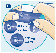 H Valitse tarvitsemasi annos tai muuta sitä kääntämällä annosvalitsinta eteen- tai taaksepäin, kunnes oikea milligrammamäärä on osoittimen kohdalla. Kun kynässä on vähemmän kuin 4,0 mg jäljellä, annosvalitsin pysähtyy jäljellä olevan milligrammamäärän kohdalle. |  |