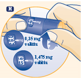 H Valitse tarvitsemasi annos tai muuta sitä kääntämällä annosvalitsinta eteen- tai taaksepäin, kunnes oikea milligrammamäärä on osoittimen kohdalla. Kun kynässä on vähemmän kuin 2,0 mg jäljellä, annosvalitsin pysähtyy jäljellä olevan milligrammamäärän kohdalle. |  |