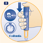I Työnnä neula ihon alle siten, kuin lääkäri tai sairaanhoitaja on neuvonut. Pistä annos painamalla annospainiketta kunnes numero 0 on näytössä osoittimen kohdalla. Samalla kun teet näin, saatat kuulla tai tuntea naksahduksen. Anna neulan olla ihon alla vähintään 6 sekuntia varmistaaksesi, että saat koko annoksen. Sinun ei tarvitse painaa annospainiketta odottaessasi. |  |