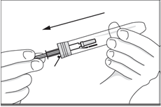 2. Avaa turvahylsy taittamalla kotelon päässä oleva värillinen kansiläppä kokonaan auki ja ota kerta-annosruisku ulos. Tarkista kerta-annosruiskun sisältö silmämääräisesti ennen käyttöä. Jos havaitset sameutta tai saostumia lääkkeessä, älä käytä sitä vaan ota toinen kerta-annosruisku. Injektioneste saattaa muuttua kellertäväksi säilytyksessä, mutta on käyttökelpoinen, jos neste on kirkasta.