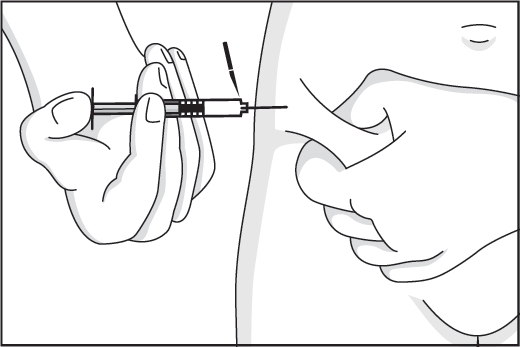 6. Tyhjennä ruiskun sisältö ihonalaiseen rasvakudokseen vatsan alueelle painamalla mäntää hitaasti pohjaan saakka. Vedä neulaa hieman ylöspäin ja laske kymmeneen ennen kuin otat neulan kokonaan pois ja päästät ihopoimun vapaaksi Ei saa pistää napaan tai 5 cm läheisyyteen navasta. Tarvittaessa lääke voidaan pistää myös muualle rasvakudokseen vatsasi lähistöllä, esim. reiden ulompaan etuosaan, pakaroiden yläosaan tai olkavarteen.