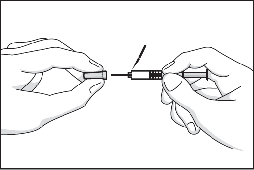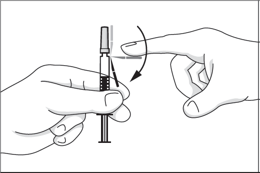 4. Poista neulan suojakorkki taivuttamatta neulaa. Ota suojakorkin tyvestä kiinni ja kierrä hieman avatessasi korkkia. Älä pidä kiinni korkin pehmeästä keskiosasta tai vedä sitä nopeasti auki.