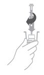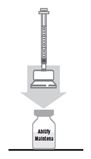 f) Aseta käyttökuntoon saatetun suspension sisältävä injektiopullo kovalle alustalle ja pidä sitä paikallaan. Kiinnitä adapteri-ruisku-yhdistelmä injektiopulloon pitämällä kiinni adapterin ulkopuolelta ja painamalla adapterin piikki tukevasti kumitulpan läpi, kunnes adapteri napsahtaa paikoilleen.