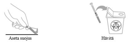 Aseta neulansuojuslaite paikalleen vaiheessa 2 kuvatulla tavalla (e). Hävitä injektiopullot, adapteri, neulat ja ruisku asianmukaisella tavalla injektion jälkeen.