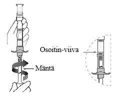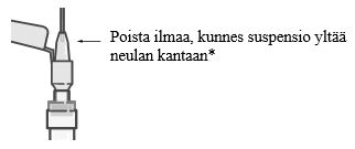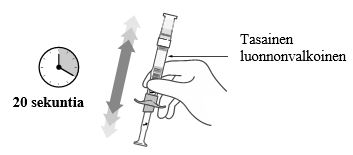 b) Ravista ruiskua pystysuunnassa voimakkaasti 20 sekuntia, kunnes käyttökuntoon saatettu suspensio näyttää tasaiselta. Suspensio on injektoitava välittömästi käyttökuntoon saattamisen jälkeen.
