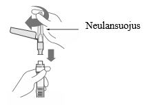 Aseta neulansuojuslaite paikalleen. Hävitä neula ja esitäytetty ruisku asianmukaisella tavalla injektion jälkeen.