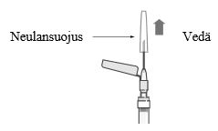 c) Pidä kiinni neulansuojuksesta ja varmista työntämällä, että neula on kiinnittynyt tukevasti neulansuojuslaitteeseen. Kierrä neulaa myötäpäivään samalla työntäen, kunnes se on tukevasti paikallaan.