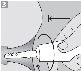 3. Asetin asetetaan sen jälkeen varovaisesti peräaukkoon, kunnes se on kokonaan paikoillaan. Asettamista voidaan helpottaa voitelemalla asetin pienellä määrällä voidetta. Paikalleen asettamisen