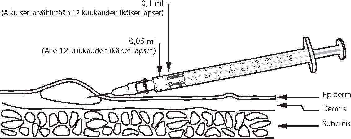 Alle 12 kuukauden ikäisille lapsille suositeltu annos on 0,05 ml ja aikuisille ja vähintään 12 kuukauden ikäisille lapsille suositeltu annos on 0,1 ml.