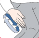 | 4. Paina injektorin musta kärki lujasti reiden ulkosivua vasten, kunnes ”klik”-ääni vahvistaa, että pistäminen on alkanut. Pidä injektori paikallaan reittä vasten 10 sekuntia (laske hitaasti kymmeneen) ja ota se sitten pois. Musta neulansuojus palautuu automaattisesti neulan päälle. |