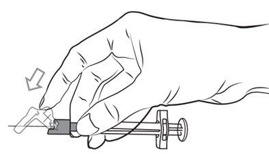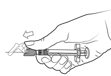 5. Vedä neulansuojus pois neulasta vetämällä sitä suoraan. Älä kierrä neulansuojusta, koska neula saattaa irrota ruiskusta.