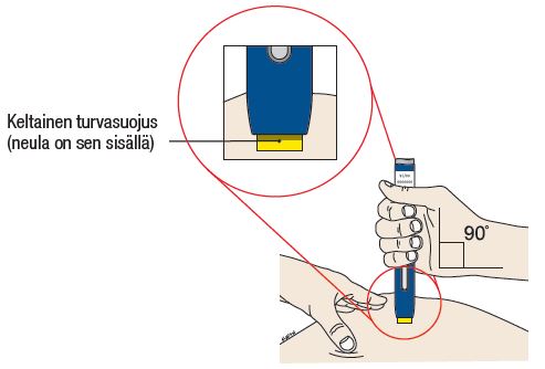 - Älä laita suojakorkkia takaisin esitäytettyyn kynään äläkä työnnä sormia keltaisen turvasuojuksen sisään.