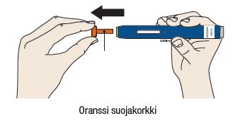 A Poista oranssi suojakorkki vetämällä suoraan ulospäin, vasta kun olet valmis pistämään lääkkeen. Oranssi suojakorkki ei saa olla poissa paikoiltaan pitempään kuin 5 minuuttia. Muutoin lääke voi kuivua.