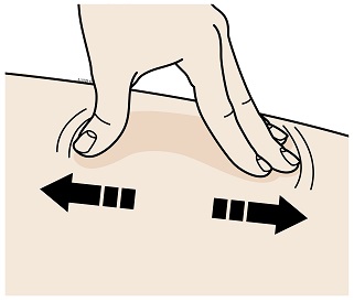 Venytä iho tiukaksi liu’uttamalla peukaloa ja sormia vastakkaisiin suuntiin niin, että väliin jää noin 5 senttimetriä leveä ihoalue.