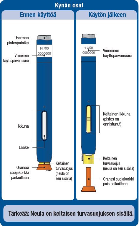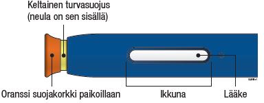 Tärkeää: Älä poista esitäytetyn kynän oranssia suojakorkkia ennen kuin olet valmis pistämään lääkkeen.