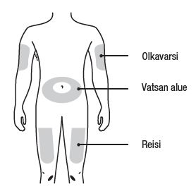 - Älä pistä ihoalueelle, joka aristaa, punoittaa, tuntuu kovalta tai jossa on mustelma. Vältä ihoalueita, joissa on arpia tai raskausarpia.
