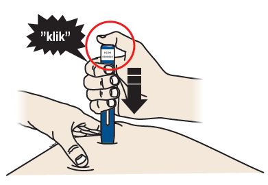 D Pidä kynä painettuna ihoa vasten. Irrota sitten peukalo pistospainikkeesta, mutta pidä esitäytetty kynä edelleen ihoa vasten. Pistos voi kestää noin 15 sekuntia.