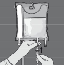 - Aseta infuusiosetin piikki tiiviisti annosteluporttiin.