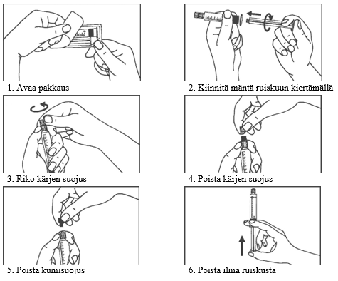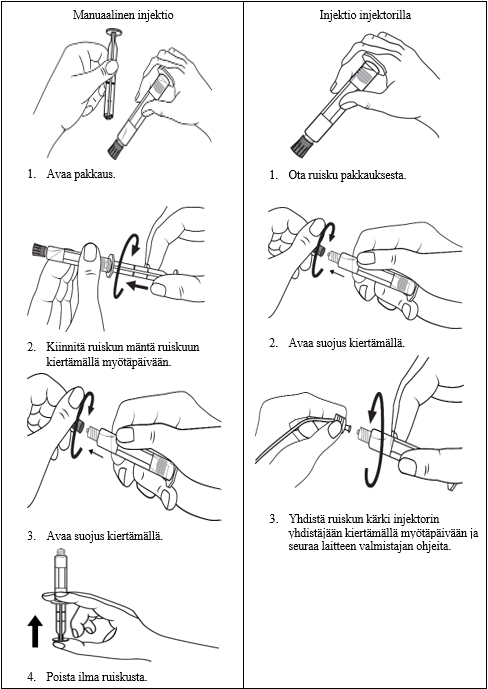 Esitäytetty ruisku valmistellaan injektiota varten juuri ennen käyttöä.