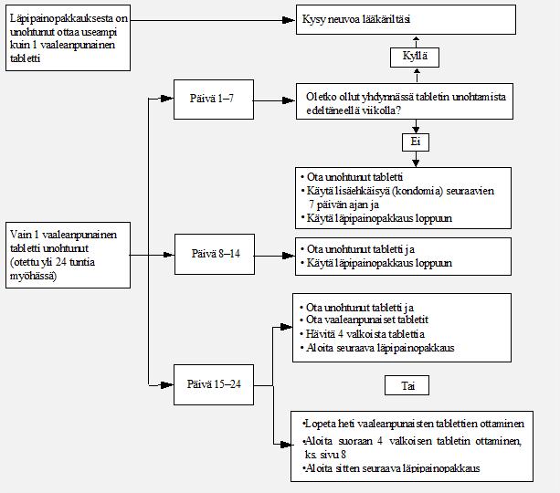 Jos otat tabletit ohjeiden mukaisesti, kuukautisesi (tyhjennysvuoto) alkavat lumetablettipäivien aikana. Jos muutat kuukautisten alkamispäivää, vähennä lumetablettipäivien määrää (älä koskaan lisää – 4 lumetablettia on enimmäismäärä!). Jos esimerkiksi kuukautisesi alkavat yleensä perjantaina ja haluat niiden alkavan tiistaina (3 päivää aikaisemmin), aloita seuraava pakkaus 3 päivää tavallista aikaisemmin. Vuoto voi jäädä tulematta tauon aikana. Seuraavan läpipainopakkauksen aikana voi esiintyä tiputtelu- tai läpäisyvuotoa.