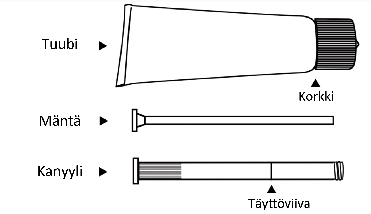 Alla olevassa kuvassa näet tuubin ja asettimen osat (männän ja kanyylin).