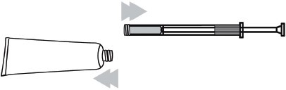 3. Täytä asetin geelillä täyttöviivaan asti puristamalla tuubia. Mäntä pysähtyy viivan kohdalle.