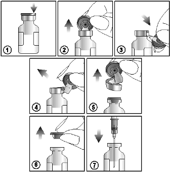 6) ja 7) poista kumitulppa, jotta pääset käsiksi injektiopullon sisältöön.