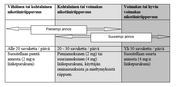 Sopivin lääkepurukumivahvuus valitaan nikotiiniriippuvuuden mukaan. Käytä 4 mg:n Nicotinell Icemint ‑lääkepurukumia, jos