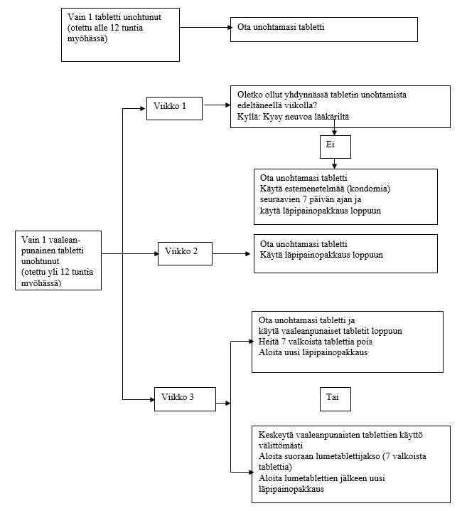 Kun otat tabletit ohjeiden mukaan, kuukautisesi alkavat lumetablettipäivien aikana. Jos haluat muuttaa tätä päivää, vähennä lumetablettijakson päivien määrää eli valkoisten tablettien määrää (älä koskaan lisää lumetablettien määrää – 7 on enimmäismäärä!). Jos esimerkiksi aloitat lumetablettien ottamisen yleensä perjantaina ja haluat vastaisuudessa aloittaa niiden ottamisen tiistaina (3 päivää aikaisemmin), sinun on aloitettava uusi läpipainopakkaus 3 päivää tavallista aikaisemmin. Tänä aikana vuotoa ei tule välttämättä lainkaan. Sitten voi esiintyä kevyttä tai kuukautisia muistuttavaa vuotoa.