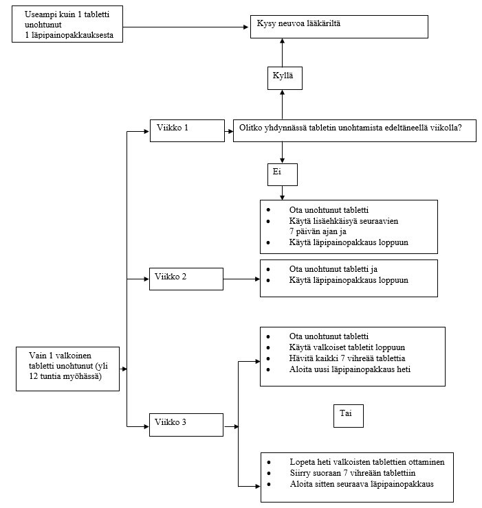 Ota unohtunut tabletti heti kun muistat (vaikka joutuisitkin ottamaan kaksi tablettia samalla kertaa) ja ota seuraavat tabletit normaaliin aikaan. Käytä lisäehkäisyä seuraavien 7 päivän ajan. Jos olit yhdynnässä tabletin unohtamista edeltäneen viikon aikana tai olet unohtanut aloittaa uuden läpipainopakkauksen lumetablettijakson jälkeen, raskaus on mahdollinen. Kerro asiasta heti lääkärille.
