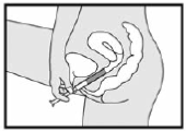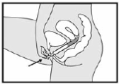 Asettimen vieminen emättimeen: Pidä täytettyä asetinta pystyasennossa ja vie asetin varovasti emättimeen niin pitkälle kuin se vaikeuksitta menee. Sinun on ehkä helpointa viedä asetin emättimeen, kun makaat selälläsi polvet koukistettuina