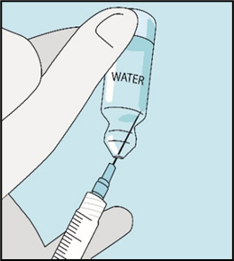 2A Vedä ruiskuun steriiliä vettä | 2B Injektoi steriili vesi kuiva-aineeseen | 2C Sekoita Hepcludex varovasti |
