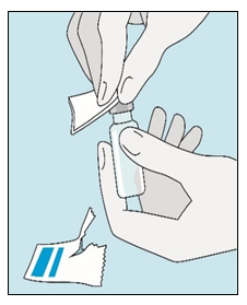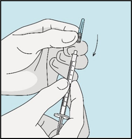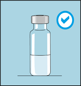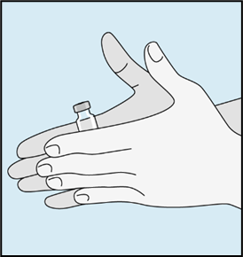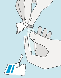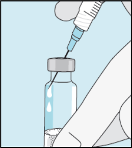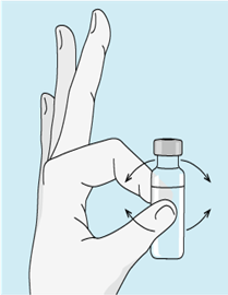 Tartu ruiskuun. Kiinnitä siihen pidempi neula. Tärkeää! Varmista, että suojuksellinen neula on tiiviisti kiinni ruiskussa: paina sitä hieman alaspäin ja käännä sitä myötäpäivään. Ota muovisuojus pois. Avaa injektionesteisiin käytettävää steriliiä vettä sisältävä injektiopullo. Työnnä neula vesiampulliin ja käännä se varovasti ylösalaisin. Varmista, että neulankärki on aina vedenpinnan alla, jotta ruiskuun ei pääse ilmakuplia. Vedä ruiskun mäntää hitaasti taaksepäin ja mittaa ruiskuun 1,0 ml steriiliä vettä. Irrota neula ja ruisku vesiampullista varovasti. | Napauta Hepcludex-injektiopulloa varovasti, jotta kuiva-aine muuttuu irtonaisemmaksi. Työnnä steriiliä vettä sisältävän ruiskun neula injektiopulloon pitämällä sitä hieman kallistettuna. Injektoi steriili vesi injektiopulloon hitaasti siten, että se valuu injektiopullon seinämää pitkin kuiva-aineeseen. Poista neula injektiopullosta ja laita ruisku ja neula turvalliseen paikkaan. | Napauta Hepcludex-injektiopulloa varovasti sormenpäälläsi 10 sekuntia, jotta kuiva-aine alkaa liueta. Pyöritä sen jälkeen injektiopulloa varovasti käsiesi välissä, jotta kuiva-aine ja vesi sekoittuvat kunnolla. Varmista, ettei kuiva-ainetta tartu kiinni injektiopullon seinämiin. Tärkeää! Älä ravista injektiopulloa. Ravistaminen saa lääkkeen vaahtoamaan, jolloin sen liukeneminen kestää paljon kauemmin. |