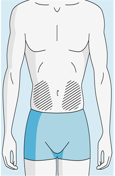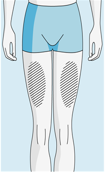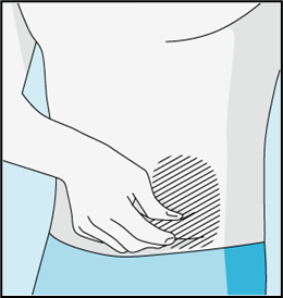 Parhaat injektiokohdat sijaitsevat vatsan alueella ja yläreisissä kuvien mukaisissa kohdissa. Hepcludexin injektiokohtaa kannattaa vaihtaa säännöllisesti. Näin voidaan vähentää mahdollisia injektiokohdan reaktioita. Älä injektoi Hepcludexia seuraaville alueille: polvet, nivuset, pakaralihaksen alaosa tai pakaroiden sisäpuoli, suoraan verisuonen päällä oleva kohta, navan ympärys, arpikudos, mustelma, luomi, leikkausarpi, tatuointi tai palovamma tai paikka, jossa on injektiokohdan reaktio. |  |  |