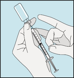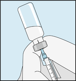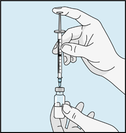 Tartu ruiskuun. Työnnä neula nestemäistä Hepcludexia sisältävään injektiopulloon. | Käännä injektiopullo varovasti ylösalaisin. Varmista, että neulankärki on aina Hepcludex-liuoksen pinnan alla, jotta ruiskuun ei pääse ilmakuplia. Tarkista injektoitava määrä uudelleen pakkausselosteen kohdan Miten valmistetta käytetään taulukosta Suositeltu annos. Vedä mäntää hitaasti taaksepäin ja ota ruiskuun tarvittava määrä liuosta. | Napauta ruiskua varovasti ja työnnä/vedä mäntää hieman, jotta ylimääräinen ilma ja kuplat poistuvat ruiskusta. Jotta ruiskuun tulisi varmasti oikea määrä Hepcludexia, voit joutua vetämään mäntää hieman yli ruiskun asteikkoviivan. Irrota neula ja ruisku injektiopullosta varovasti. Tärkeää! Hävitä injektiopullo ja mahdollinen käyttämättä jäänyt ylimääräinen liuos käytön jälkeen. | Irrota pidempi neula ruiskusta ja hävitä se asianmukaisesti, jotta se ei vahingoita ketään. Tärkeää! Älä laita muovisuojusta takaisin neulan päälle. |
