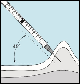 Laita ruiskuun lyhyempi neula. Tärkeää! Varmista, että suojuksellinen neula on tiiviisti kiinni ruiskussa: paina sitä hieman alaspäin ja käännä sitä myötäpäivään. Ota muovisuojus pois. | Valitse injektioon eri kohta kuin se, johon injektoit lääkkeen viimeksi. Puhdista injektiokohta käyttämättömällä alkoholipitoisella desinfiointilapulla. Aloita keskeltä, paina hieman ja puhdista kohta pyörivin ja ulospäin suuntautuvin liikkein. Tärkeää! Anna kohdan kuivua hetki. | Purista sormiesi väliin ihopoimu injektiokohdasta. | Pistä neula ihoon 45 asteen kulmassa. Neula tulee työntää ihon alle lähes koko pituudeltaan. Työnnä mäntää hitaasti sisään loppuun asti ja injektoi Hepcludex. Vedä neula ulos ihosta. Irrota neula ruiskusta ja hävitä se ja ruisku asianmukaisesti, jotta ne eivät vahingoita ketään (ks. kohta '3D). |
