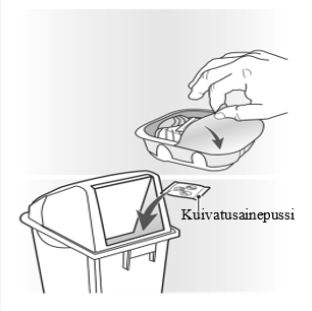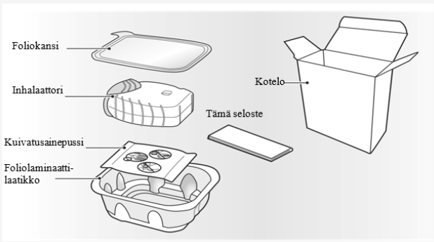 Inhalaattori on foliolaminaattilaatikossa. Älä avaa foliolaminaattilaatikkoa ennen kuin olet valmis käyttämään uutta inhalaattoria. Kun olet valmis käyttämään inhalaattoria, irrota foliokansi avataksesi foliolaminaattilaatikon. Foliolaminaattilaatikko sisältää kosteutta vähentävän kuivatusainepussin. Heitä tämä kuivatusainepussi pois – älä avaa, syö äläkä hengitä sitä.
