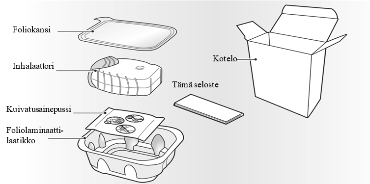 Inhalaattori on foliolaminaattilaatikossa. Älä avaa foliolaminaattilaatikkoa ennen kuin olet valmis ottamaan lääkettä. Kun olet valmis käyttämään inhalaattoria, irrota foliokansi avataksesi foliolaminaattilaatikon. Foliolaminaattilaatikko sisältää kosteutta vähentävän kuivatusainepussin. Heitä tämä kuivatusainepussi pois – älä avaa, syö äläkä hengitä sitä.