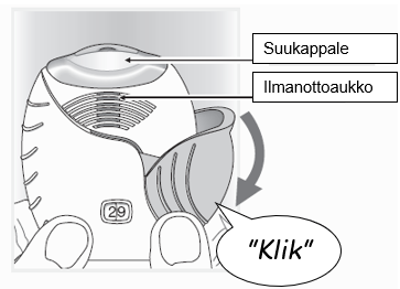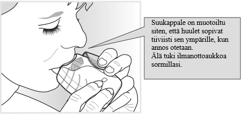 Älä hengitä laitteeseen. - Vie suukappale huulien väliin ja purista huulet tiukasti sen ympärille.