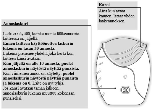 Kun jäljellä on alle 10 annosta 14 annoksen laitteelle, puolet annoslaskurin näytöstä näyttää punaista. Kun viimeinen annos on käytetty, annoslaskurin näyttö näyttää puoliksi punaista ja lukema on 0. Annoslaskurin näyttö näyttää kokonaan punaista, jos kansi avataan uudelleen.