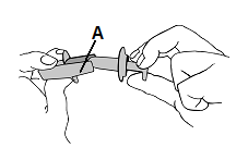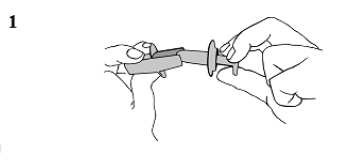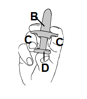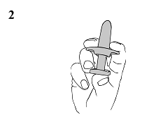 - Pidä nenäsumutinta kevyesti kädessäsi sormien ja peukalon avulla kuvan 2 osoittamalla tavalla. Älä paina vielä mäntää!