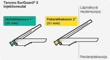 - Kaksi Terumo SurGuard®3 -neulaa lihakseen annettavaa injektiota varten (neulanpistosuojalla varustettu 21 G UTW 1” (0,8 mm × 25 mm) turvaneula hartialihakseen antoa varten ja neulanpistosuojalla varustettu 20 G TW 2” (0,9 mm × 51 mm) turvaneula pakaralihakseen antoa varten).