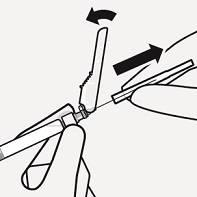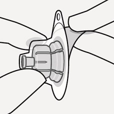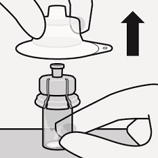 Pidä kiinni injektiopullon pohjasta ja irrota steriili muovikotelo vetämällä sitä ylöspäin.