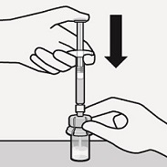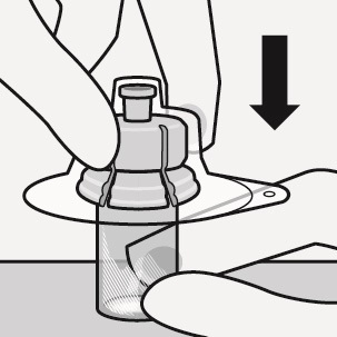 Aseta injektiopullo kovalle alustalle ja pidä kiinni pullon pohjasta. Aseta injektiopullon liitin harmaan kumitulpan keskelle. Paina injektiopullon liitintä kohtisuoraan injektiopulloon, kunnes se napsahtaa tiiviisti paikalleen.