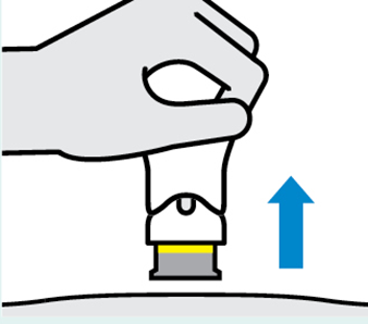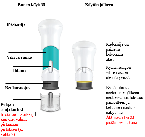 ÄLÄ NOSTA ESITÄYTETTYÄ KYNÄÄ PISTÄMISEN AIKANA! Jos nostat kynää, neulansuojus lukittuu paikoilleen, keltainen nauha tulee näkyviin etkä saa täyttä annosta. |