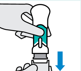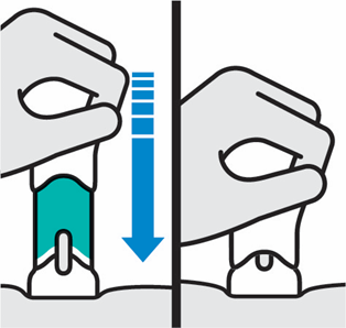 Jotta pistät täyden annoksen, paina pistoksen aikana kädensija kokonaan alas, kunnes kynän rungon vihreä osa ei ole enää näkyvissä. ÄLÄ NOSTA ESITÄYTETTYÄ KYNÄÄ pistämisen aikana. Jos nostat esitäytettyä kynää, se lukittuu etkä saa täyttä annosta. |