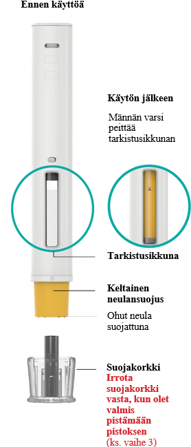 Älä koske keltaiseen neulansuojaan! Se voi käynnistää pistoksen pistämisen, jolloin annos jää saamatta. |