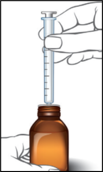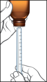 10. Irrota mäntä ruiskun runko‑osasta ja huuhtele molemmat osat hanan alla. Älä pese mittaruiskua astianpesukoneessa. Ravistele vesi pois molemmista osista ja jätä ne kuivumaan ilmavasti seuraavaan käyttökertaan asti. Varmista, että mittaruisku on täysin kuiva ennen seuraavaa käyttökertaa. Jos pulloon pääsee vettä, liuos voi näyttää samealta. Pullossa olevan liuoksen samentuminen ei vaikuta sen tehoon. Jatka lääkkeen käyttöä normaaliin tapaan. |