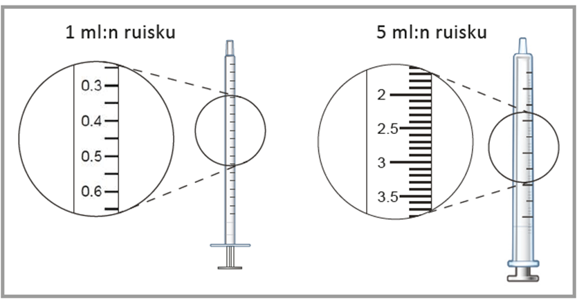 5 ml:n ruiskuihin on merkitty mitta‑asteikko 0,1 ml:n asteikkovälein ja 1 ml:n ruiskuihin taas 0,05 ml:n asteikkovälein.
